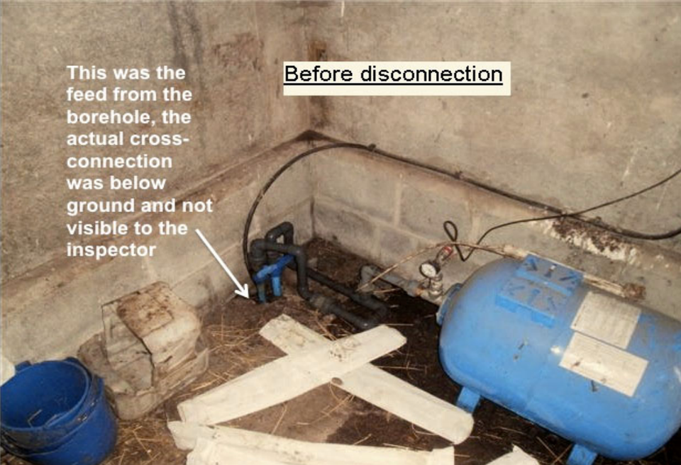 Villagers taste complaints lead to the discovery of a cross connection between the mains and a borehole supply on a local farm