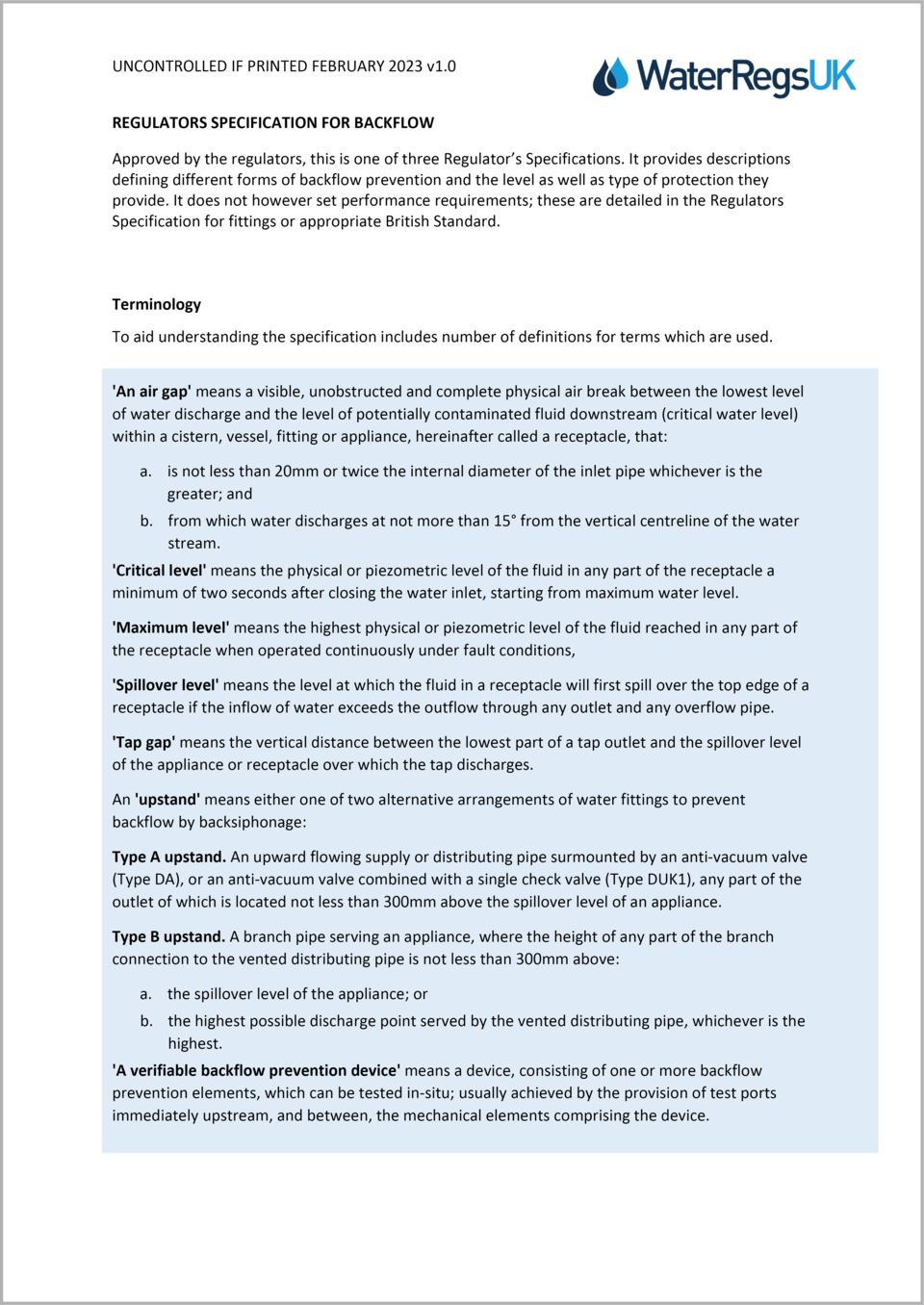 For the purposes of the water fittings regulations in England, Wales and Northern Ireland, byelaws in Scotland, backflow occurs when fluid flows in the opposite to the intended or normal direction of flow.